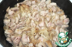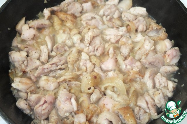 Добавляем порезанную на небольшие кусочки курицу, воду и тушим минут 5 - 7.