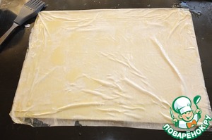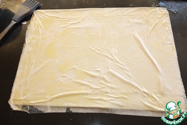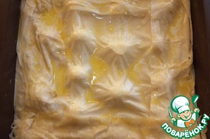 Лист фило складываем пополам, тщательно промазываем растопленным маслом. -