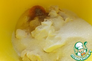 Сливочное масло комнатной температуры, творог, яйцо, сахар, ванильный сахар взбиваем миксером до однородной пышной массы.