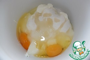 Сметану, яйца, сахар, ванильный сахар взбиваем миксером до растворения крупинок сахара.