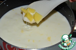 В кастрюлю, желательно с антипригарным покрытием, добавить молоко, воду, сливочное масло, картофель небольшими кубиками, соль.