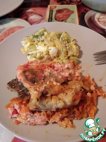 На противень выложить часть моркови с луком, сверху рыбу, а на рыбу остаток обжаренных овощей. Залить соусом.