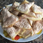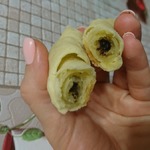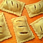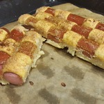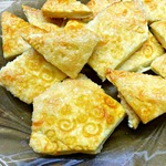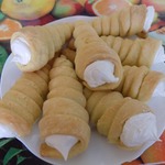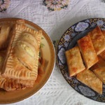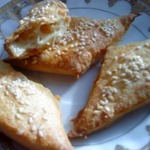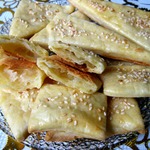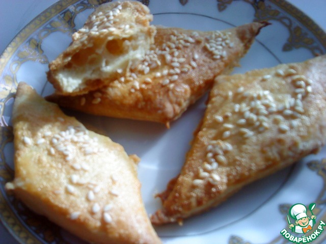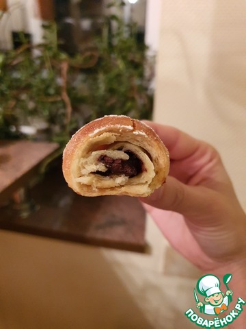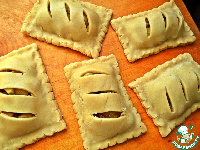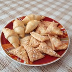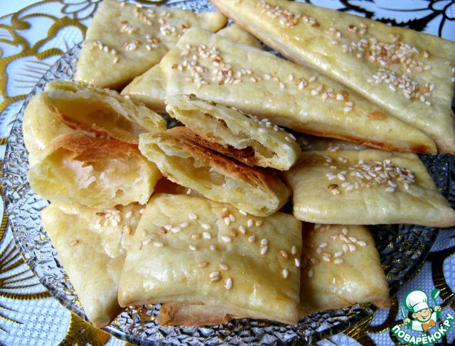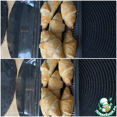 Просто отрезаем кусочек теста и раскатываем, с помощью ножа для пиццы разрезаем на треугольнички и ромбики. Если потоньше, то будет меньше слоев, если потолще, то больше слоев