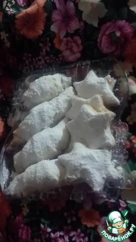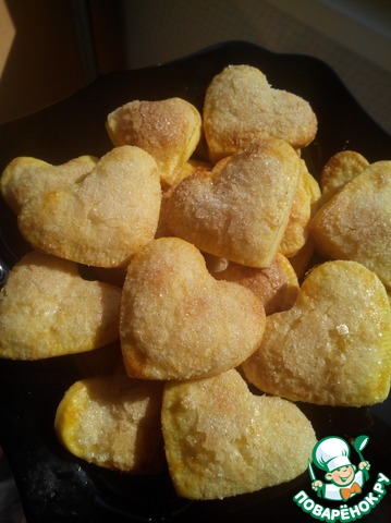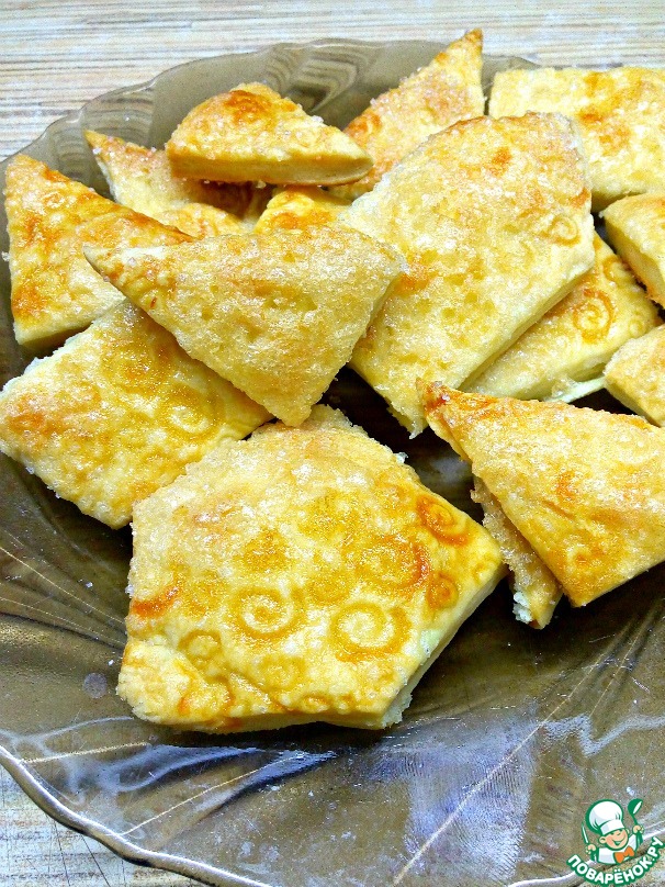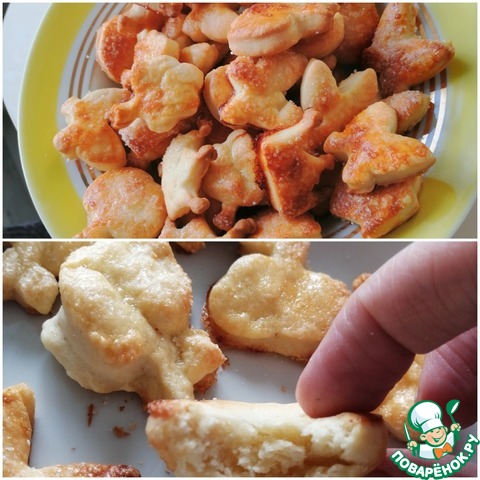 Противень посыпаем мукой и каждый треугольничек обмакиваем в белок, а потом в сахар, с одной стороны и сухой стороной вниз укладываем на противень, чтобы сахар был сверху. Из этой нормы теста получается 4 противня печенья. Выпекаем до золотистого цвета при 180С.
