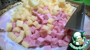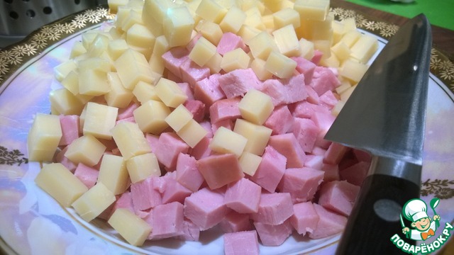 • Сыр и ветчину нарезаем кубиками.