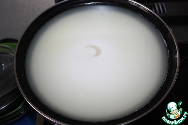 Молоко нагреть до температуры 30 градусов. Добавить мезофильную закваску. Если у Вас нет специальной сырной закваски, используйте сметану, сыворотку или пахту. Количество закваски по инструкции, если заменяете сметаной и т. п., то 4 ст. л. Если используете пастеризованное молоко, то внесите хлористый кальций, растворенный в воде. Внесите молокосвертывающий фермент. Количество фермента в 2 раза меньше, чем требуется по инструкции. Оставить при комнатной температуре на 6-12 часов. Должен сформироваться сгусток, сверху покрытый сывороткой
