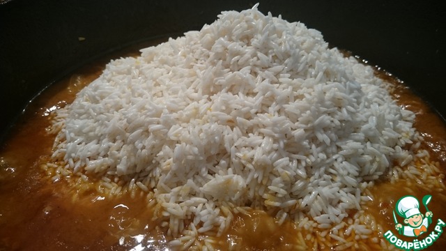 • Как только наша смесь достаточно потушилась, добавляем рис!