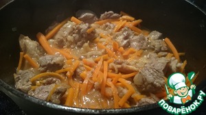 • Когда мясо обжарилось (немного потушилось), добавляем морковь.