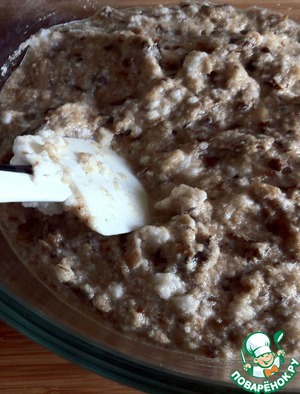 С хлеба срезать корочки, нарезать его кубиками. Залить мякиш 1/2 стакана грибного отвара, добавить соевый соус от Kikkoman. Оставить на 5 минут, затем хорошенько растереть лопаткой.