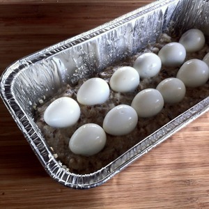 Форму размером 22*11 см смазать подсолнечным маслом и присыпать панировочными сухарями. Выложить половину пудинговой массы. Поверх нее отваренные и очищенные перепелиные яйца.