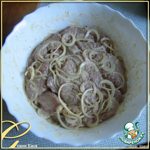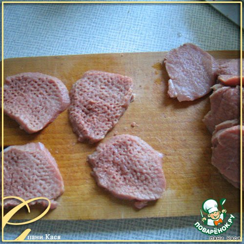 • Свинину тонко нарезать, отбить.