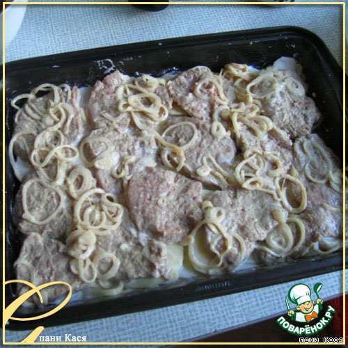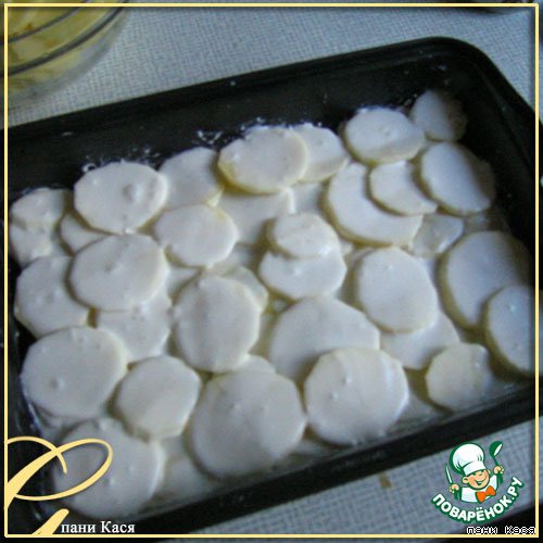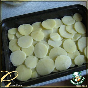 • Картошку нарезать колечками, уложить в форму.