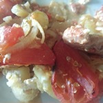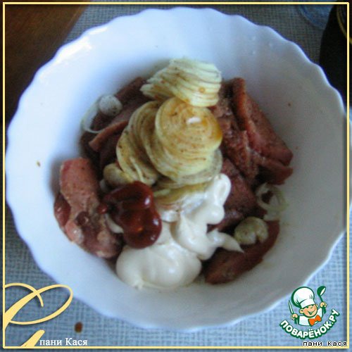 • Смешать с нарезанным луком, майонезом и томатным соусом, посолить, поперчить (сделайте соуса чуть побольше, он нам пригодится).