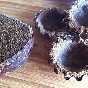 • C ломтиков хлеба обрезать корки. С помощью кисточки смочить их водой с обеих сторон. Уложить в формочки, придавливая мякиш к стенкам. Я не смазывала формочки, ничего не прилипло. Подсушить при 180 градусах 10-15 минут.