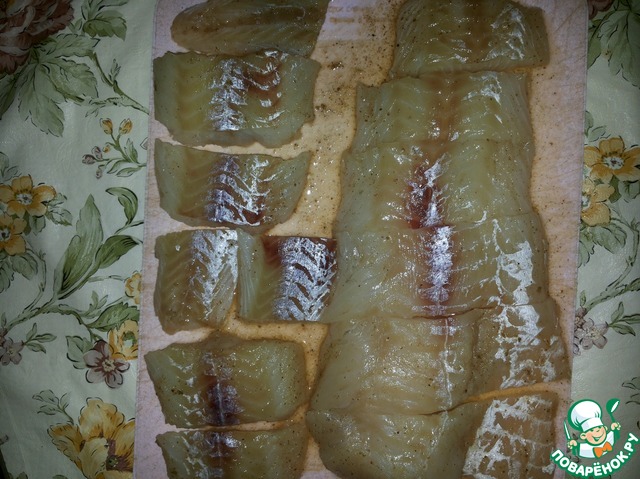 Теперь берём наше немного пропитавшиеся филе и нарезаем на порционные кусочки.