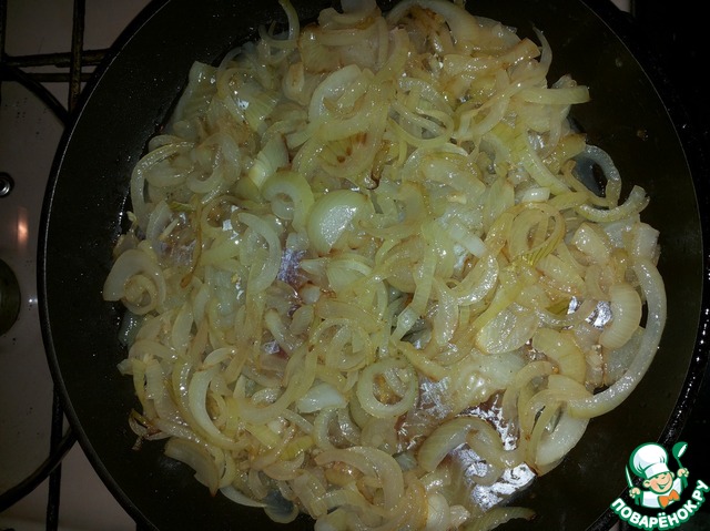 Лук очищаем от кожицы, нарезаем кольцами (полукольцами) и обжариваем на масле.
