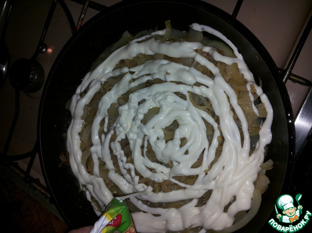 И заливаем майонезом ( у меня майонезный соус). Тушим под крышкой при слабом нагреве 30-40 минут. В конце посыпаем зеленью.