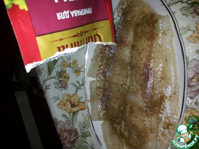 Если рыба целая, то её обрабатываем, удаляем голову, разрезаем вдоль позвоночника и удаляем его. Оставшееся филе с кожей и рёберными костями заправляем солью и перцем (или приправой для рыбы) -