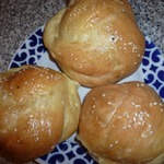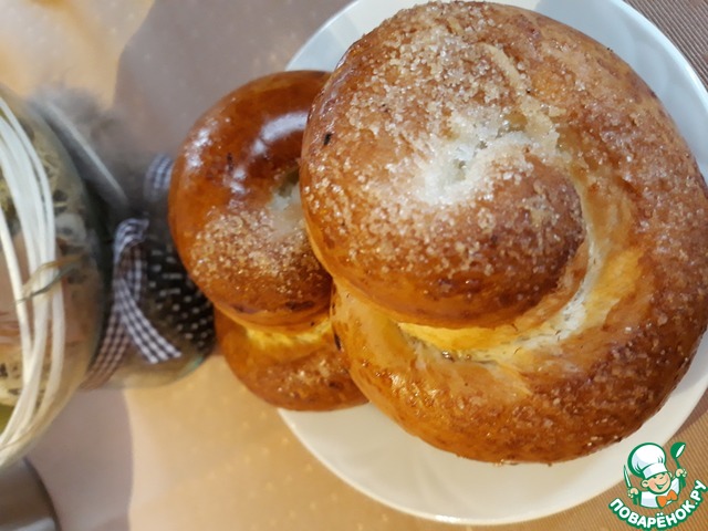 Через 90 минут узелки нужно смазать взбитым яйцом, слегка присыпать сахаром, кунжутом. Кунжут можно заменить на мак. Как видно на фото, я сделала недостаточно большое расстояние и мои узелки прижались друг к другу.