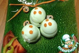 Собрать закуску, чередуя квадратики омлета и начинку.