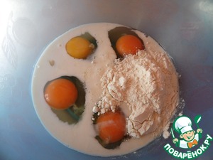 Яйца смешать с молоком, мукой, солью и перцем, хорошо взбить.