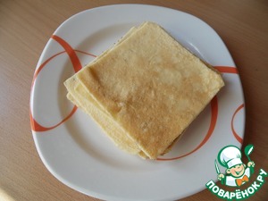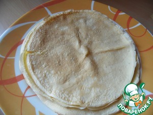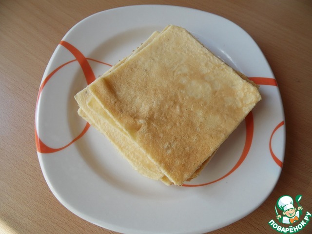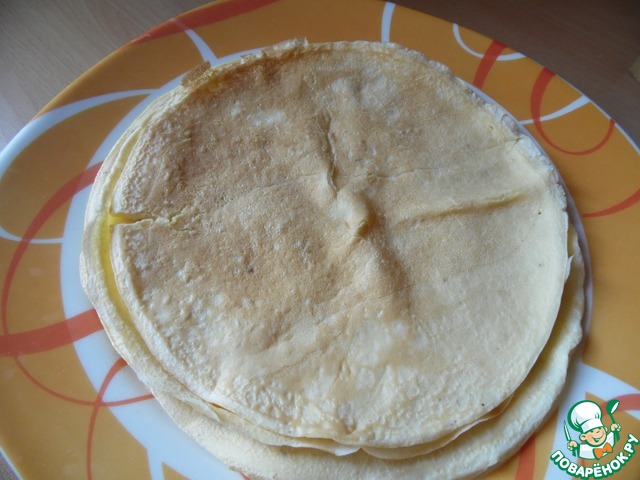 Из полученного теста испечь на раскаленной сковороде блинчики-омлетики. Должно получиться 5 штук (сковородка диаметром 22 см).