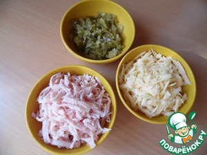 Ветчину, сыр и соленые огурцы натереть на крупной терке. Подготовленные ингредиенты для начинки смешать.
