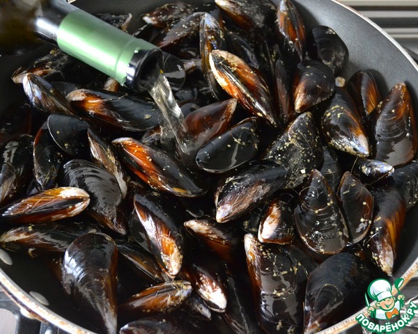 • В большую сковороду выложить мидии и, добавив белое сухое вино, поставить на огонь, накрыть крышкой и дать раковинам открыться!