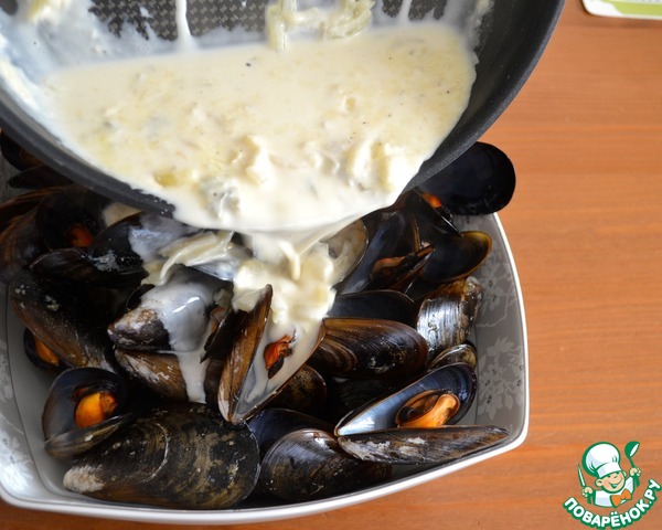 • Добавить 3 столовые ложки жидкости из сковороды с мидиями. Перемешать все, пока сыр не расплавится и не превратиться в соус. Влить сливки (в оригинале - крем-фреш (crème fraiche). Опять размешать. Количество сливок т густоту соуса можно регулировать по своему вкусу...