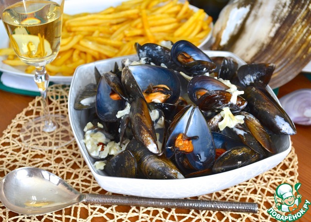 Если Вы являетесь любителем морепродуктов, и мидий, в частности... или если Вам посчастливилось жить вблизи от моря, (или просто у Вас продают свежии мидии), то приготовить такое блюдо Вам не составит большого труда... (не считая, конечно, процесса очистки самих мидий). И я очень Вам советую попробовать это бдюдо! Количество всех ингредиентов в рецепте приведено на 1 кг мидий, поэтому, в случае увеличения их количества, увеличить и другие составляющие блюда!