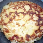 Выливаем яйца в картофель. Перемешиваем. Снизу тортилья должна схватиться и образоваться корочка. Придаем нашей тортилье округлую форму.