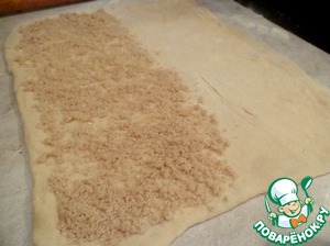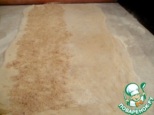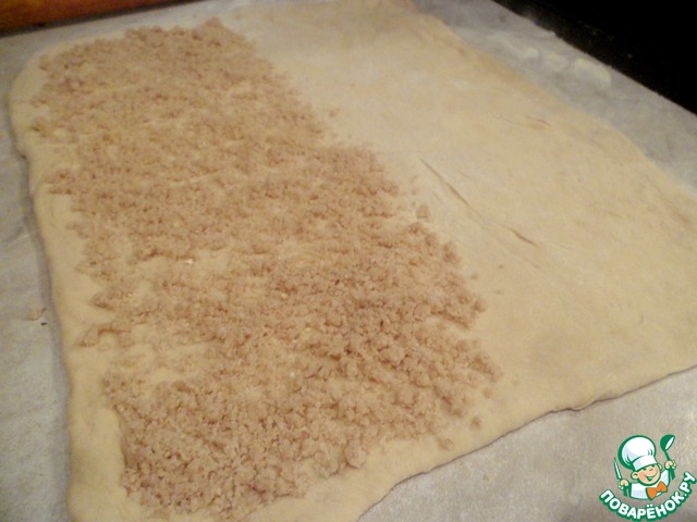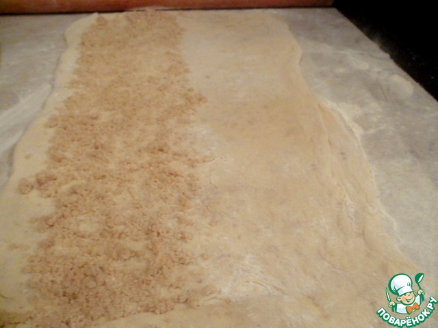 Готовое тесто раскатать и одну половину посыпать штрейзелем, накрыть второй половиной теста и раскатать.