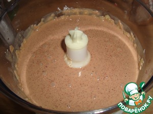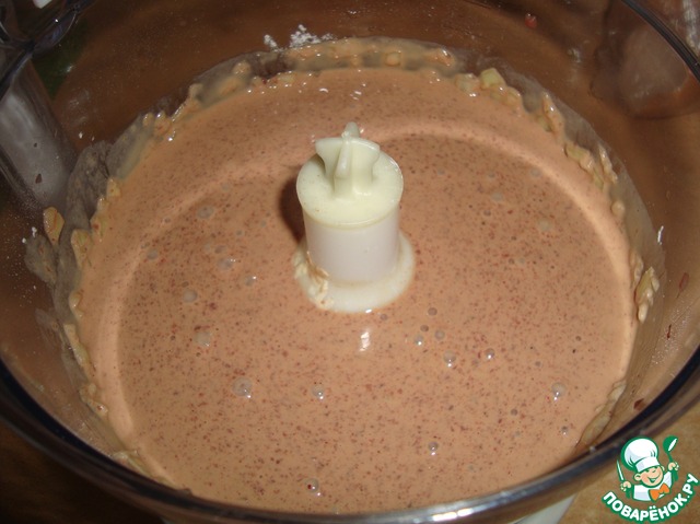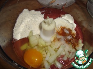 Начнем с приготовления паштета. В чашку блендера выложим печень, прокручиваем ее. Далее добавляем остальные составляющие паштета: лук (я его порезала), яйцо, сметану, соль, приправы (у меня черный, красный перец), муку и взбиваем