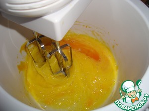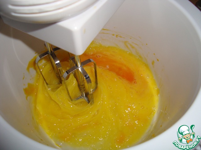 Теперь приступим к бисквитному тесту: в миксере взбиваем яйца с сахаром до пышной белой массы. В конце добавляем соль. Затем ложкой, аккуратно вмешиваем муку
