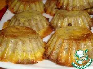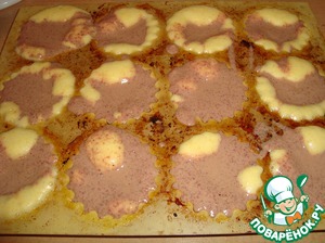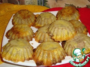 Сверху налила по 2 ст. ложке печеночного паштета и... поняла, что не получится паштет на бисквитном тесте, т. к. паштет начал тонуть, а тесто выпирать вверх. Но эксперимент есть эксперимент. Отправила формочки в духовку, заранее разогретую до 160 градусов на 30 минут. Жду, томлюсь, немного расстроенная тем, что не получился паштет именно на тесте, думаю как выйти из положения, и...