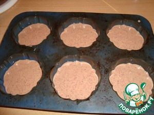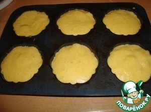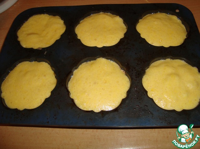 Далее, делая все по найденному рецепту: смазала подсолнечным маслом маленькие кексовые формочки (ой, не пугайтесь вида формочек, они так часто бывают в духовке, что стали такими страшненькими и не хотят никак отмываться), налила в каждую формочку по 1 ст. ложке бисквитного теста