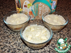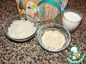 Рисовые хлопья залить горячим молоком, дать настояться до остывания и разбухания хлопьев. Смешать с вареным рисом.