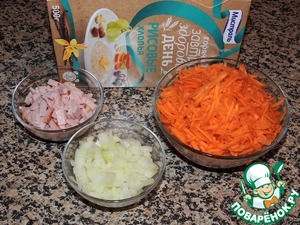 Лук и бекон мелко порезать, обжарить на небольшом количестве растительного масла. Добавить крупно натертую морковь, спассеровать.