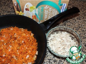Такой питательный и эффектный ужин очень несложно приготовить, если имеются остатки готового риса и вареной курочки. А добавление рисовых хлопьев с молоком делает запеканку плотной и сливочной.