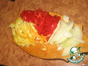 Перцы очистить от семян, нарезать тонкой соломкой. Лук полукольцами.