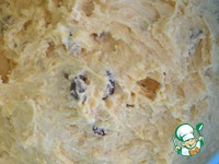 Смешать смесь для кекса, хлопья 7 злаков, куриные яйца, цедру апельсина, изюм и сливочное масло. |