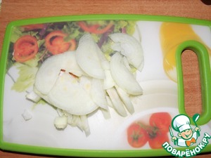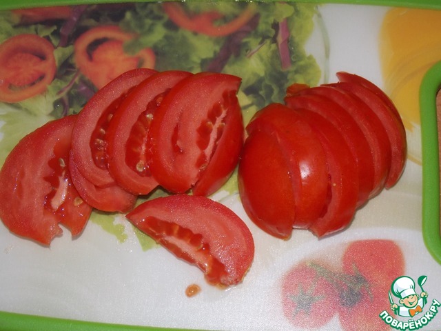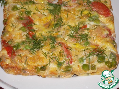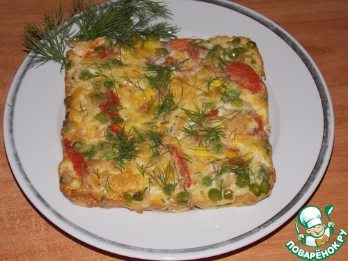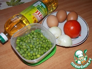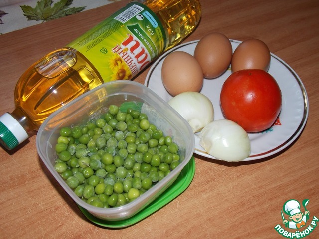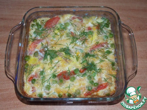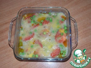 Лук обжарить на растительном масле до полуготовности, добавить помидор и горошек, немого посолить. Потушить 2-3 минуты. Овощи выложить в форму для запекания.