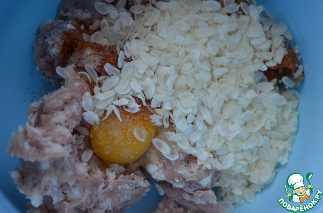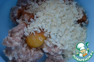 В мясной фарш добавить, рисовые хлопья, куриное яйцо. Всё посолить, поперчить и перемешать до однородной массы.