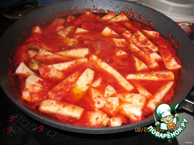 Добавить кабачки в помидорную смесь и кипятить 20 минут.
