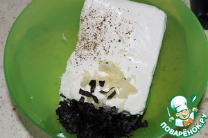 Для творожной массы: в миску выложить творог, посолить, поперчить, добавить порубленный базилик, выдавить чеснок. Тщательно перемешать вилкой.