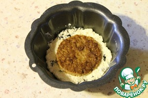 На дно формочки выложить 1 ст. л. творожной массы, хорошо утрамбовать, затем положить кружочек печени, и так далее, чередуя последовательность. Последним слоем должна быть творожная масса.