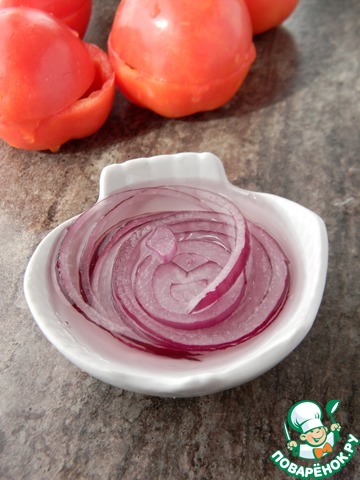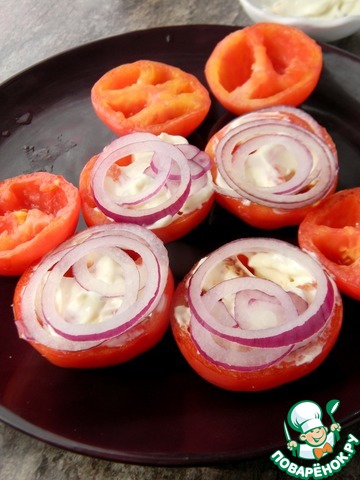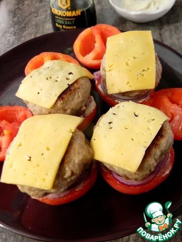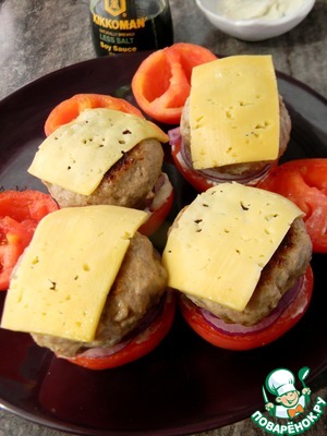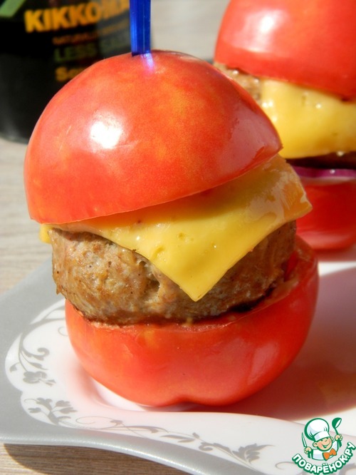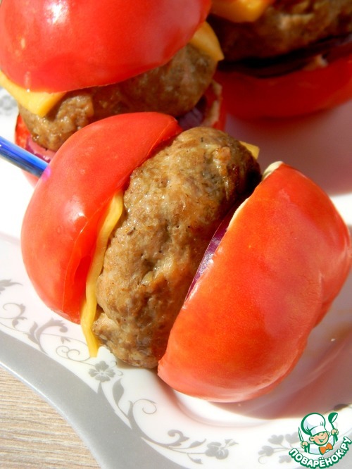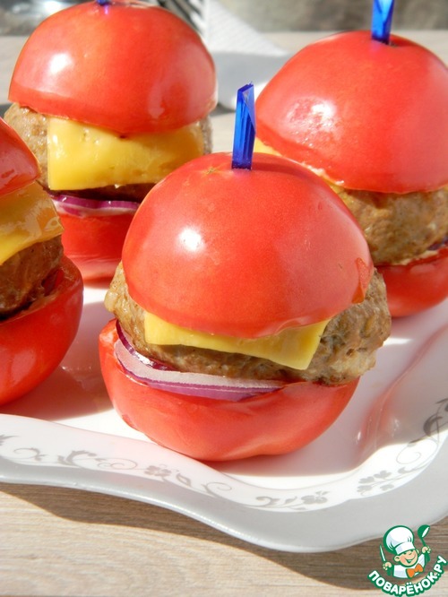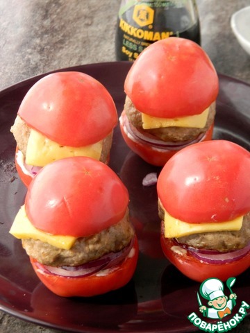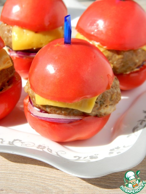 Необычная и яркая закуска. Сочная котлета с луком и соусом "спрятана" не в булочке, а в подпеченном помидоре, мне кажется оригинально и интересно... а вам?... Идея позаимствованная из интернета и корректирована под наш вкус.