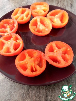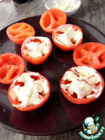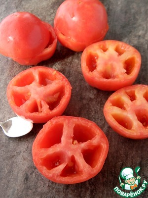 Одинаковые помидоры разрезать пополам, мякоть вычистить ложечкой.