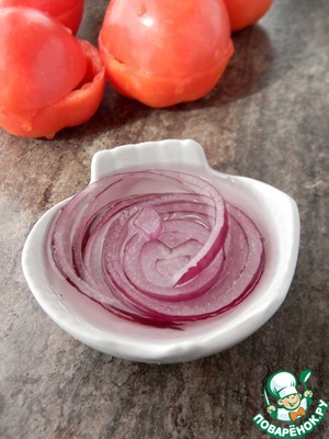 Лук нарезать тонкими кольцами и залить холодной водой, оставить на несколько минут.
