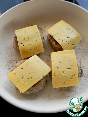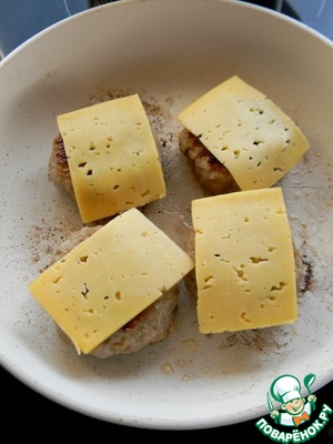 В конце жарки положить на каждую котлету ломтик сыра, дать немного расплавиться.